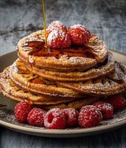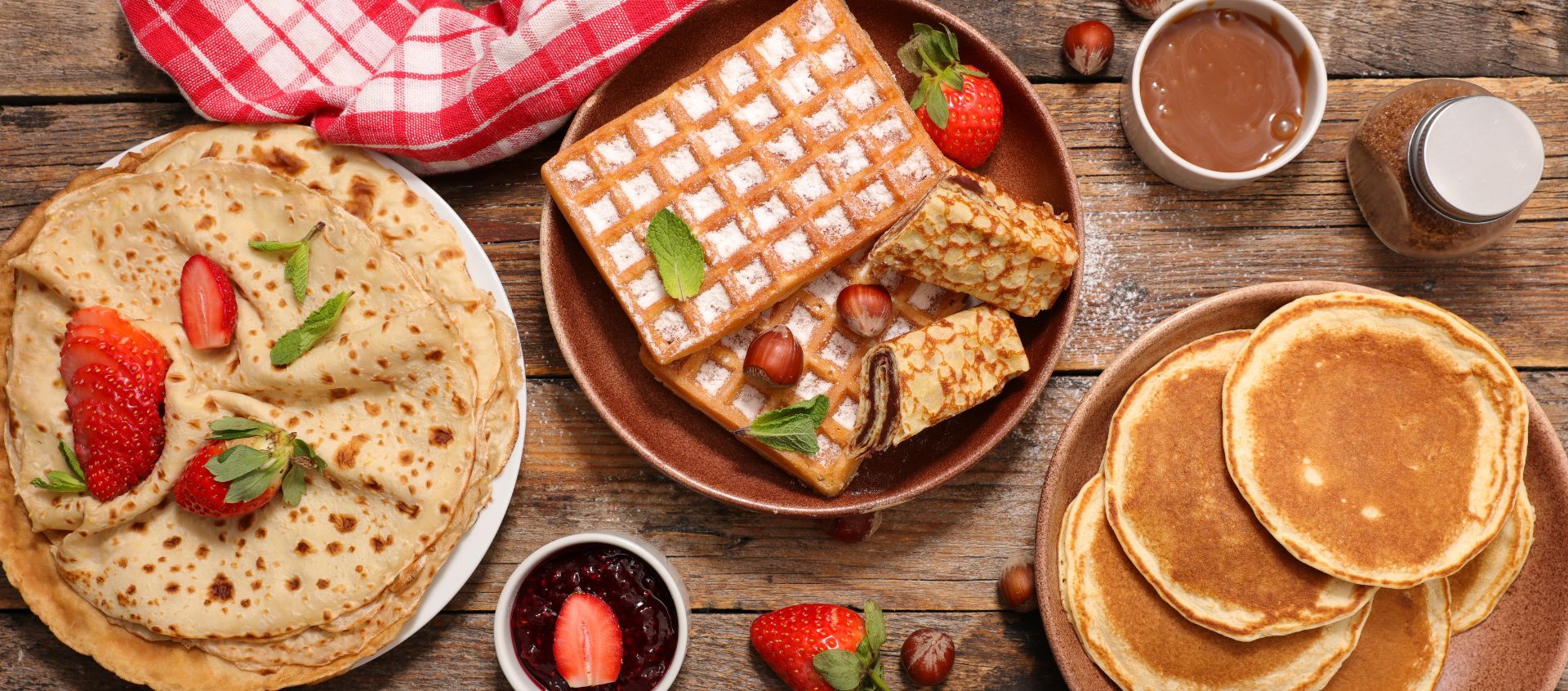 Waffles and Pancakes: Decadent options like the Belgium Classic, Brownie Mountain, Cookie & Cream, and Nutella Banana, each served with accompaniments like whipped cream, maple syrup, and vanilla ice cream.